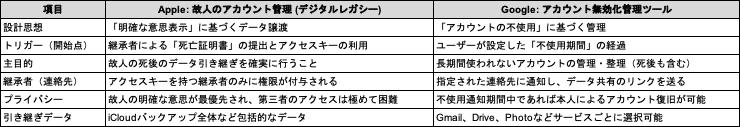 Appleは生前の明確な意思、Googleはアカウントの不使用をトリガーとする点で、アプローチは異なる。