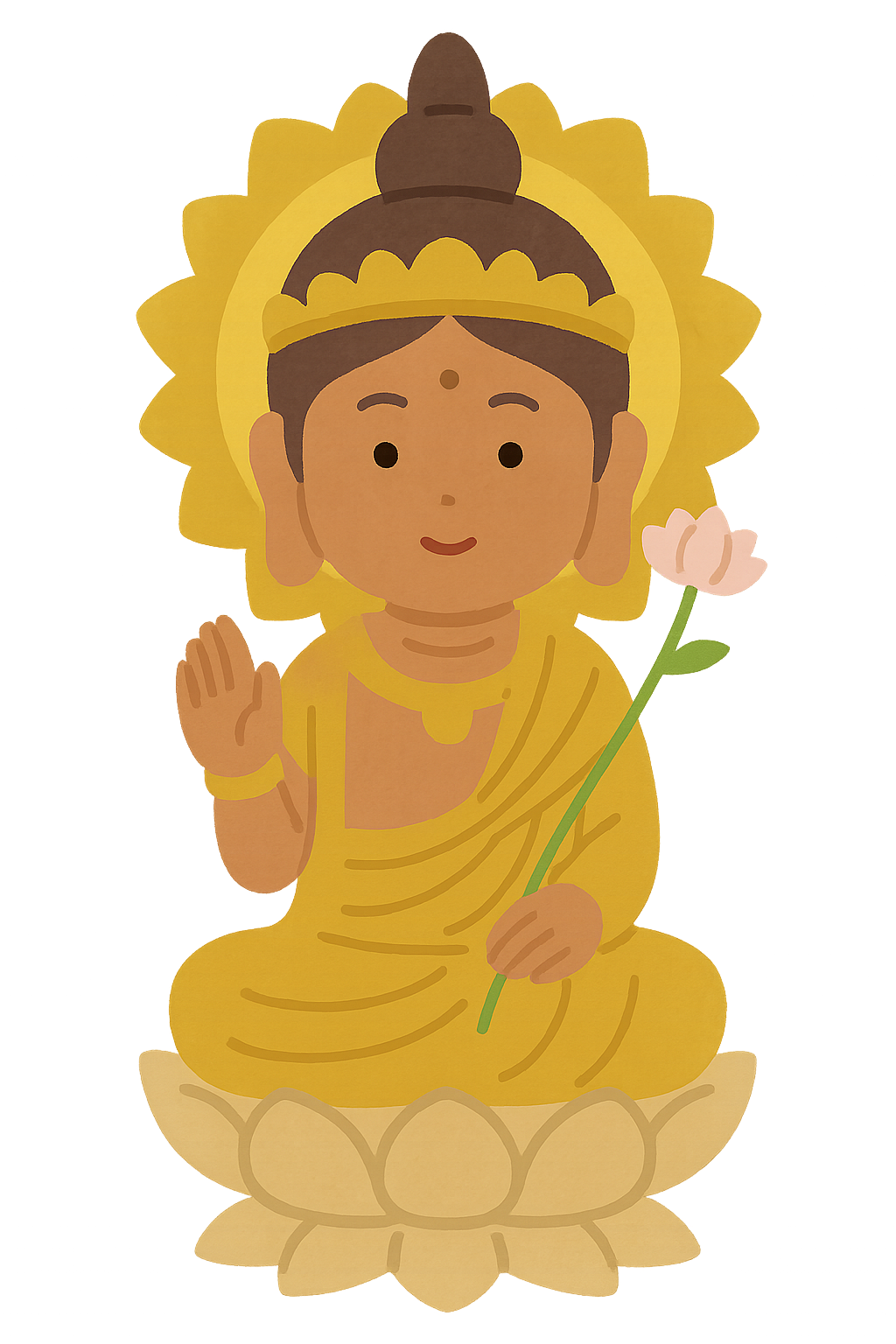 • 外見的特徴:最高の悟りを得たがゆえに、外的な飾りは一切不要とされる。簡素な法衣(ほうえ)を纏い、頭髪は螺髪(らほつ)という粒状の巻き毛になっているのが一般的だ。身体には三十二相八十種好という仏特有の優れた身体的特徴を備えている。装飾のなさこそが、悟りの純粋さと偉大さを示すのだ。